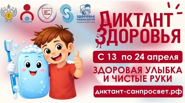 Во исполнение поручения Президента Российской Федерации в рамках Послания к Федеральному Собранию от 21.04.2021 года реализуется федеральный проект Роспотребнадзора «Санитарный щит страны – безопасность для здоровья (предупреждение, выявление, реагирование)», который является социально значимым стратегическим государственным проектом и направлен на развитие проактивной и устойчивой системы защиты населения от биологических и санитарно-эпидемиологических угроз. Одной из важных составляющих частей федерального проекта является комплексный коммуникационный проект «Санпросвет», цель которого – продвижение и популяризация санитарной грамотности, распространение гигиенических знаний и навыков среди населения. В рамках реализации проекта «Санпросвет» Федеральная служба по надзору в сфере защиты прав потребителей и благополучия человека при организационно-методическом сопровождении ФБУН «Новосибирский НИИ гигиены» Роспотребнадзора и Союза «Здоровье наших детей» проводит Всероссийскую санитарно-просветительскую акцию «Диктант здоровья-2026» (далее – Диктант). Первый модуль Диктанта «Здоровая улыбка и чистые руки» проводится с 13 по 24 апреля 2026 года и посвящен вопросам соблюдения правил гигиены рук и полости рта. Второй этап «Движение – жизнь. Питаемся правильно» запланирован с 4 по 22 мая, третий этап «Используем гаджеты рационально» - с 15 сентября по 6 октября. В дни проведения первого трека с 13 по 24 апреля 2026 года участникам необходимо перейти на сайт и ответить на вопросы. Проект ориентирован на все возрастные группы: школьников, студентов, родителей, а также на старшее поколение. Мероприятие направлено на популяризацию знаний о принципах здорового образа жизни, профилактику заболеваний и формирование ответственного отношения к своему здоровью. Диктант содержит 20 вопросов. Вопросы сгруппированы по тематикам. По каждому вопросу предложены 4 варианта ответа – необходимо выбрать один верный, по мнению участника акции, если участник затрудняется с выбором ответа в связи с отсутствием необходимых навыков и знаний, он может выбрать ответ – «не знаю». на формирование у населения навыков здорового образа жизни и повышение гигиенической грамотности. Сразу после завершения тестирования участник может ознакомиться с результатами, получить экспертные пояснения и сгенерировать именной сертификат. Стартует первый этап Всероссийской акции «Диктант здоровья»: проверяем знания о гигиене полости рта и чистых руках С 13 по 24 апреля 2026 года Роспотребнадзор запускает первый тематический трек Всероссийской санитарно-просветительской акции «Диктант здоровья» — «Здоровая улыбка и чистые руки». Модератором проекта выступает ФБУН «Новосибирский НИИ гигиены» Роспотребнадзора. Проект реализуется в рамках коммуникационной стратегии «Санпросвет». Цель акции — сделать научно-обоснованные знания о здоровье доступными и полезными для каждого жителя страны, от школьников до людей старшего поколения. О чем узнают участники? Первый этап посвящен двум важнейшим компонентам личной гигиены, которые являются основой профилактики множества заболеваний: Гигиена полости рта. Многие считают, что умеют чистить зубы, но статистика кариеса говорит об обратном. Участники узнают: • почему важно чистить зубы регулярно; • что полезно и вр